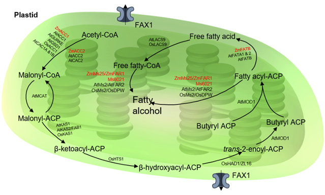 在脂酰基-ACP硫酯酶的催化下,部分脂酰基ACP水解,释放游离脂肪酸和酰基载体蛋白;同时其它脂酰基ACP在脂酰基ACP还原酶的作用下,可生成脂肪醇;此外一些脂肪酸可被LACS9催化生成游离脂酰基辅酶A,随后被转化为脂肪醇。脂肪酸转运蛋白FAX1通过α-螺旋跨膜结构域定位在质体/叶绿体内膜上,介导质体/叶绿体中从头合成的脂肪酸的运输(图1)。